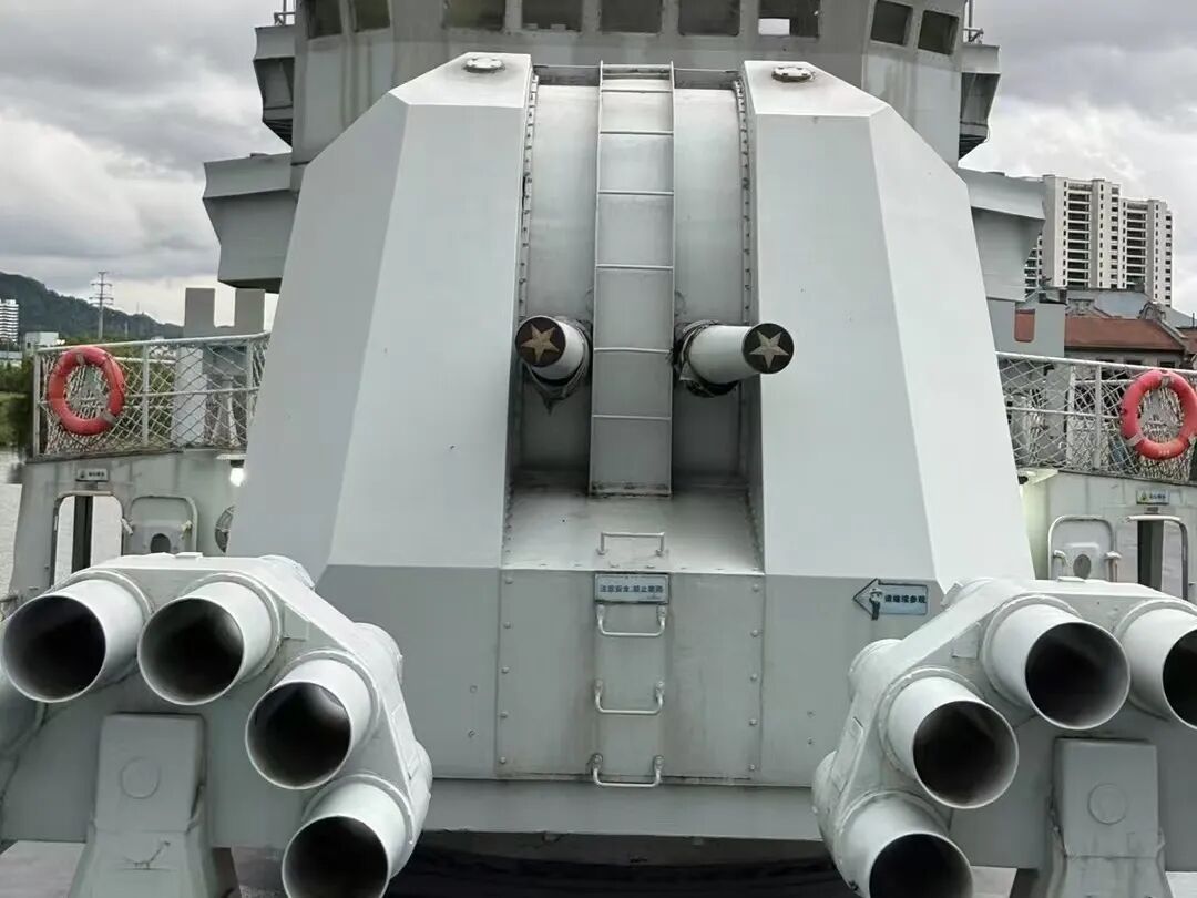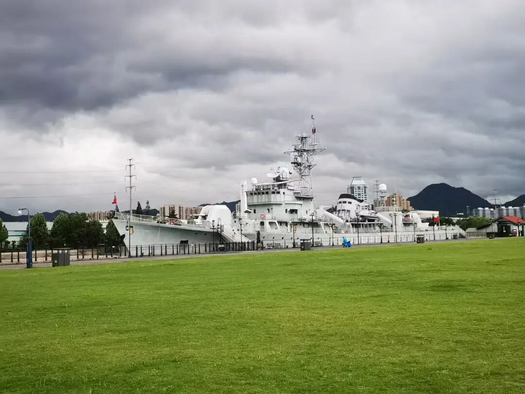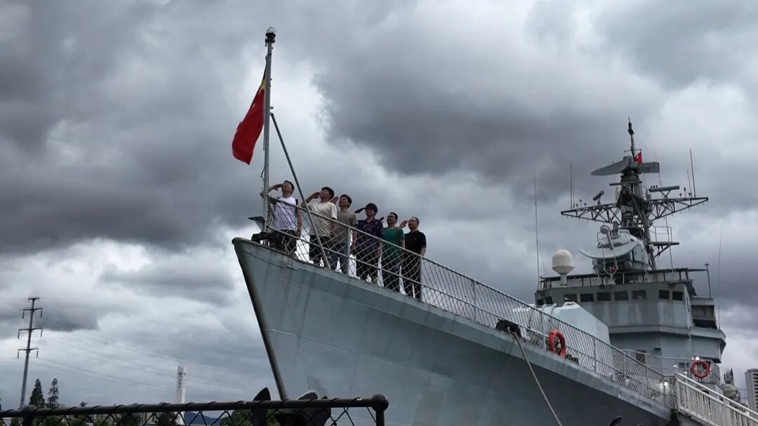 "快看!金華艦!是真的!"不知是誰喊了一聲,幾個小伙子已冒雨沖向甲板。他們不約而同地在艦橋上立正,向著飄揚的紅旗敬禮。對岸夜總會的霓虹在水洼里碎成彩色的星河,而艦炮依然倔強地昂首向天。