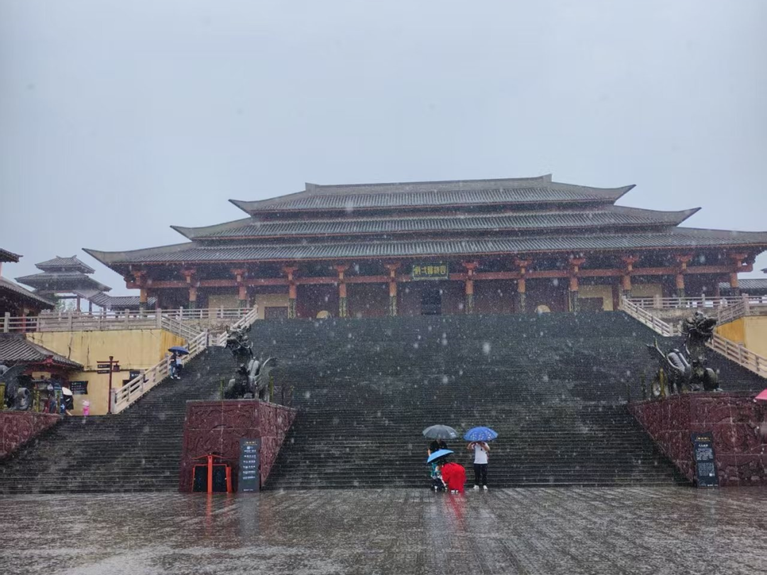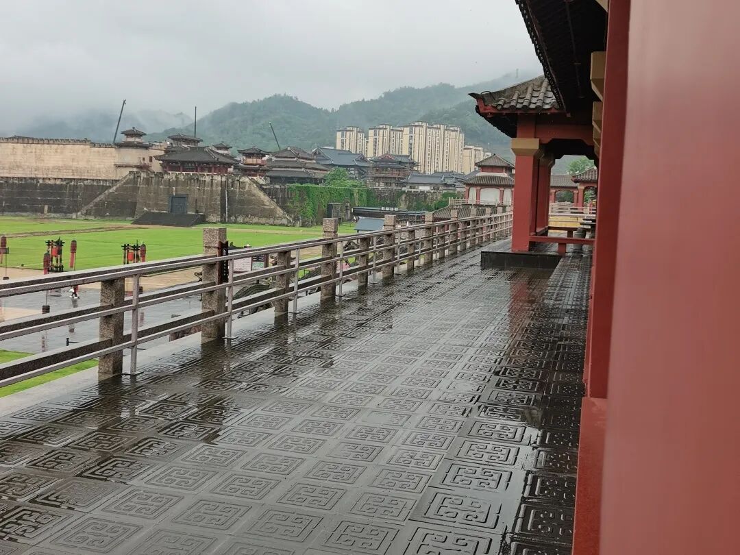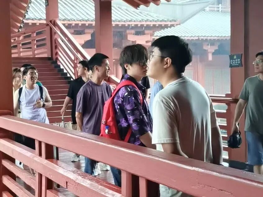 午餐過后,我們的首站便是恢弘壯闊的秦王宮——這座見證過《英雄》《瑯琊榜》《慶余年》等傳奇故事的殿堂,此刻正靜靜等待著盛蝶團隊的到來。微雨中的秦王宮,青石臺階泛著水光。就在我們攀登99級臺階時,細雨突成暴雨。傘下,有人主動攙扶恐高的小伙伴,有人在前方加油鼓勵。當(dāng)全員抵達"四海歸一殿"時,被雨水模糊的匾額卻讓團隊的身影格外清晰——這張微雨中的合照證明:風(fēng)景不在終點,而在共同跨越障礙的路上。